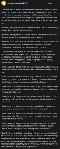 arrow-up1212arrow-down1imageThe thing a lot of people don't get about Lovecraft's cosmic horror...lemmy.zipMorph9@lemmy.zipM to Lovecraft Mythos - Cosmic Horror@lemmy.worldEnglish · 4 months agomessage-square46linkfedilinkfile-text