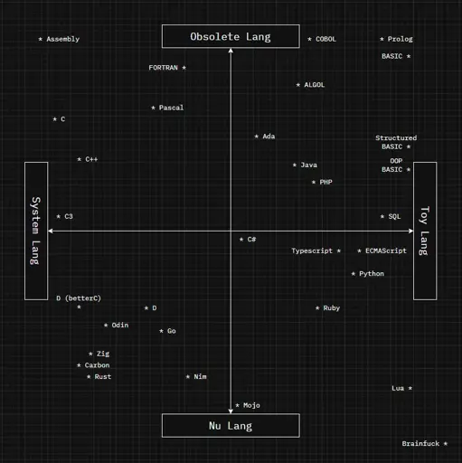 Yeah, the axes on this are weird, why would the opposite of a systems language be a toy language? And why is Lua, a very popular and commonly used language in tons of stuff, a “toy”? And Lua is a nu Lang? It’s older than Java, maybe it just feels newer because each release isn’t necessarily backwards compatible?
