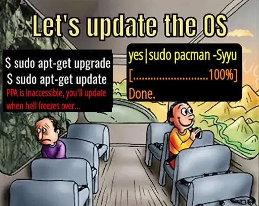 I’m getting used to arch on my main desktop and I still can’t figure out why the hell “sync” is the wording pacman uses for updating or why ‘y’ is refresh. Sync refresh upgrade my ass. I will admin, it is fast.Because you’re “sync”ing with the state of the repo. You’re not necessarily upgrading. Sometimes the repos have a lower version than what you have, so you would be downgrading in that case. Or sometimes you’re just using it to install a new package and its dependencies.