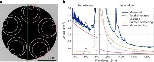 The new design maintains low losses of around 0.2 dB/km over a 66 THz bandwidth and boasts 45% faster transmission speeds."