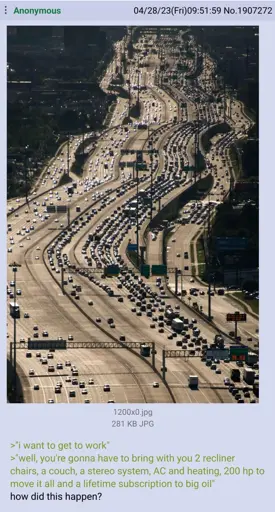 Then when the people in the sprawled-out suburbs want to visit the city centers anyway, because that’s where jobs and shopping inevitably are (People live where people live), they have to build massive roads to get in and out.