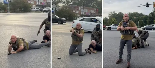 The officer apparently tried to tuck a gun into his pants instead of using a holster, failed, dropped the gun, and menaced bystanders in response to his own failure