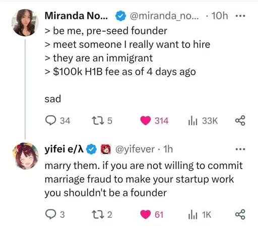 However, the H1B shit just seems to a) exploit minorities/immigrants while holding their visa over their head (dems shouldn’t like this based on their principles) while b) outsources jobs that could likely be given to existing, qualified citizens (republicans shouldn’t this based on their principles), c) all to ultimately benefit a corporation’s quarterly earnings.