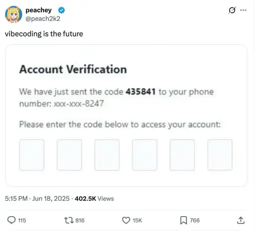 ☆ Yσɠƚԋσʂ ☆@lemmy.ml to Programmer Humor@lemmy.mlEnglish · 2 months agoVibecoding is the futurelemmy.mlimagemessage-square15linkfedilinkarrow-up1217arrow-down11cross-posted to: programmer_humor@programming.dev