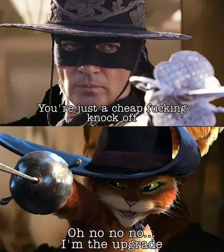minus-squareMentalEdge@sopuli.xyzlinkfedilinkarrow-up22·edit-212 days agoThe dreamworks Puss in Boots voice actor is the actual Zorro live action actor. They made Puss in Boots a parody of Zorro, as an elaborate joke. It’s already funny, and gets even funnier as you realize it’s the actual Zorro actor playing a cat, doing a parody, of himself, as Zorro. This meme too is a new level of funny, when you realize both charachters are the same actor.