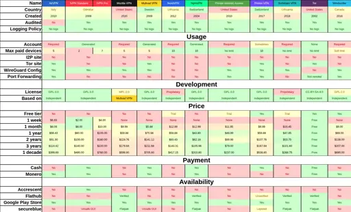 Also, heat map conditional formatting favoring free is a bad metric. Free VPNs steal data, and Tor isn’t a VPN, so this skews all the other paid options to seem negative.