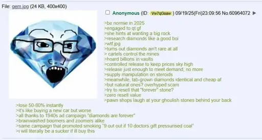 arrow-up1558arrow-down1imageAnon shops for diamondssh.itjust.works🍹Early to RISA 🧉@sh.itjust.worksM to Greentext@sh.itjust.works · 18 days agomessage-square136linkfedilink