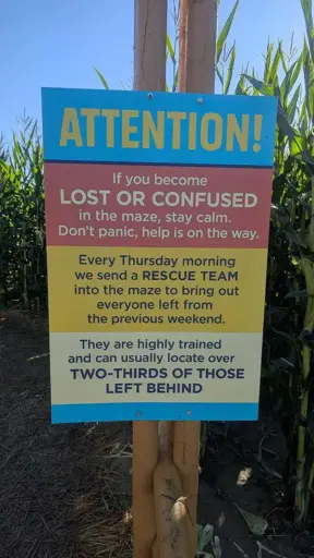 The sign is a joke, because you can just walk through the corn in any direction to leave the maze. This is, however, discouraged. (The mazes usually are for the whole family and not particularly hard in the first place.)