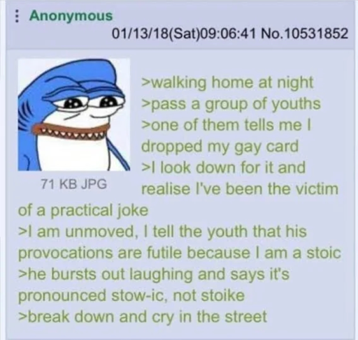 defunct_punk@lemmy.world to Greentext@sh.itjust.worksEnglish · edit-21 month agoAnon is a stoiclemmy.worldimagemessage-square32linkfedilinkarrow-up1523arrow-down19