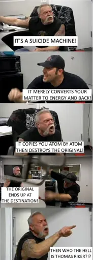I mean, just because it happens fast or in an unnoticeable way doesn’t mean it doesn’t happen. If somebody vaporized themselves instantly it’s still suicide. Sure, people would probably accept the fact that their original is being killed for convenience, but the fact stays.
