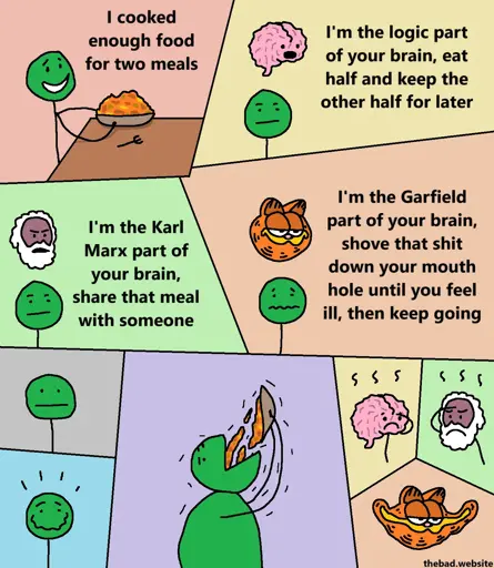 [floating Garfield head] I’m the Garfield part of your brain, shove that shit down your mouth until you feel ill, then keep going