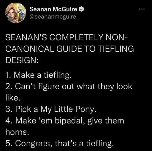 Stamets@lemmy.dbzer0.com to RPGMemes @ttrpg.network · 20 days agoGuide to Tiefling Designlemmy.dbzer0.comimagemessage-square19linkfedilinkarrow-up1328arrow-down120