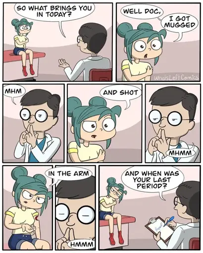 All the panels are related, that’s how a narrative works. A lack of media literacy doesn’t make it wrong, because women get it without needing an explanation. Unless the guys in the comments are actual doctors, they’re just a large volume of unsupported opinions. It is not routine to ask about a period in an emergency, the medical emergency is the context.