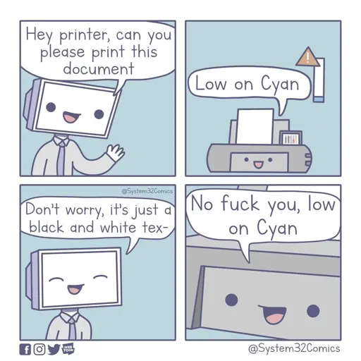 I have a brother colour laser printer that’s been complaining about being low on magenta for like… a year now. Still prints black and white just fine.